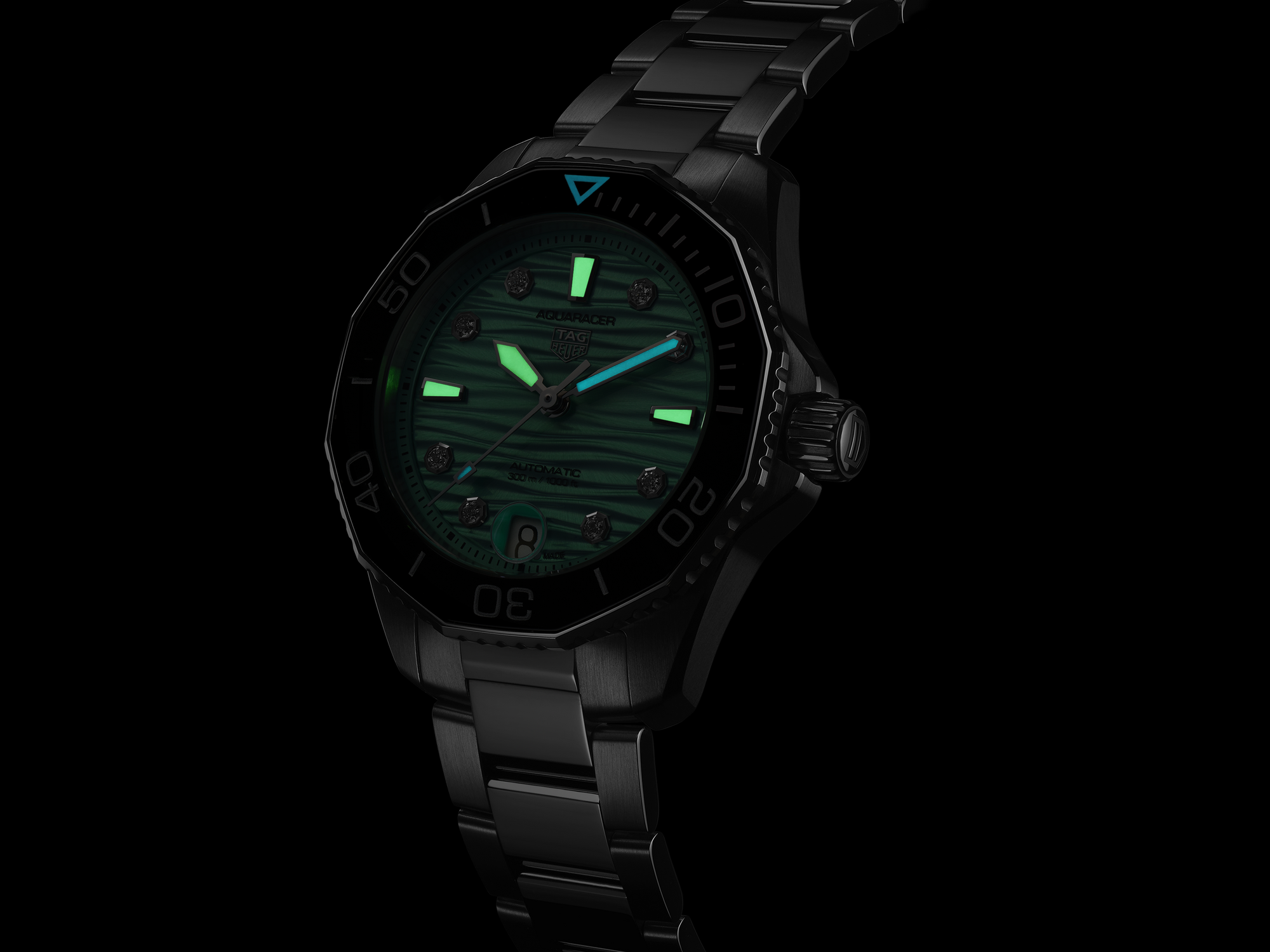Paying tribute to warm waters, the wavy turquoise dial of this TAG Heuer Aquaracer professional 300 shows eight superb VS 1.4mm-diametre diamonds (0.078ct).