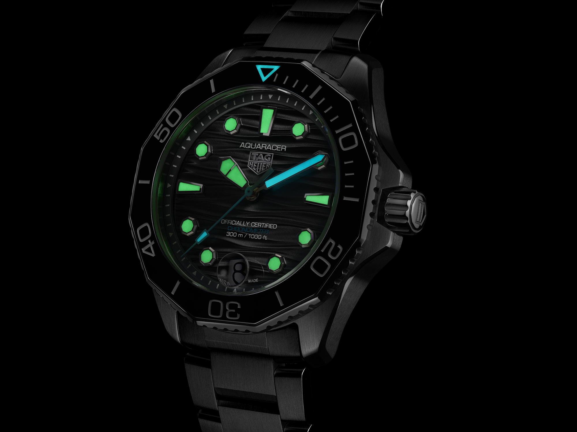 The black wavy pattern dial shows luminous white Super-LumiNova®-filled indexes and hands, while a light blue central hand adds a splash of color.
