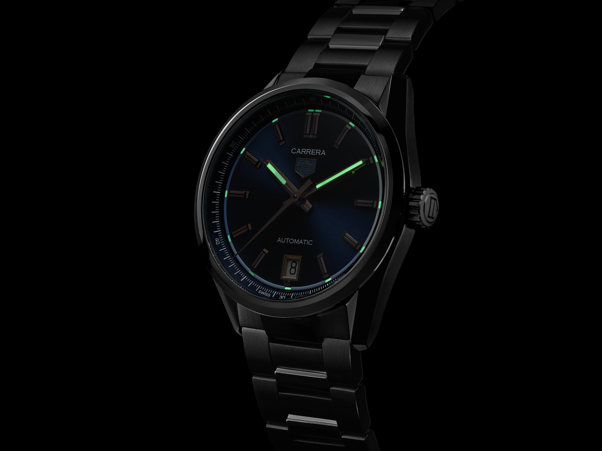The thin 36mm steel case houses the TAG Heuer Calibre 7 Automatic movement, with a 56-hour power reserve. Water-resistant to 50 metres.