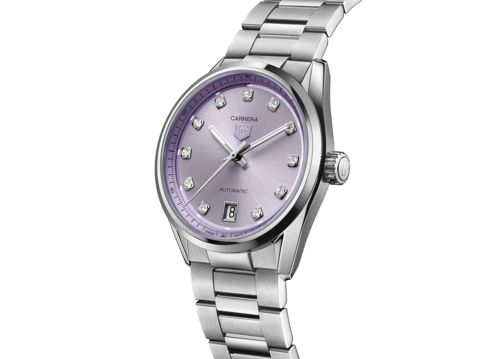 Automatic, 36 mm, Steel WBN2319.BA0001The TAG Heuer Carrera Date in 36mm brings a fresh touch to the collection with a captivating lilac dial. Featuring diamond-set indexes and powered by the Calibre 7 movement, this timepiece combines elegance with precision.