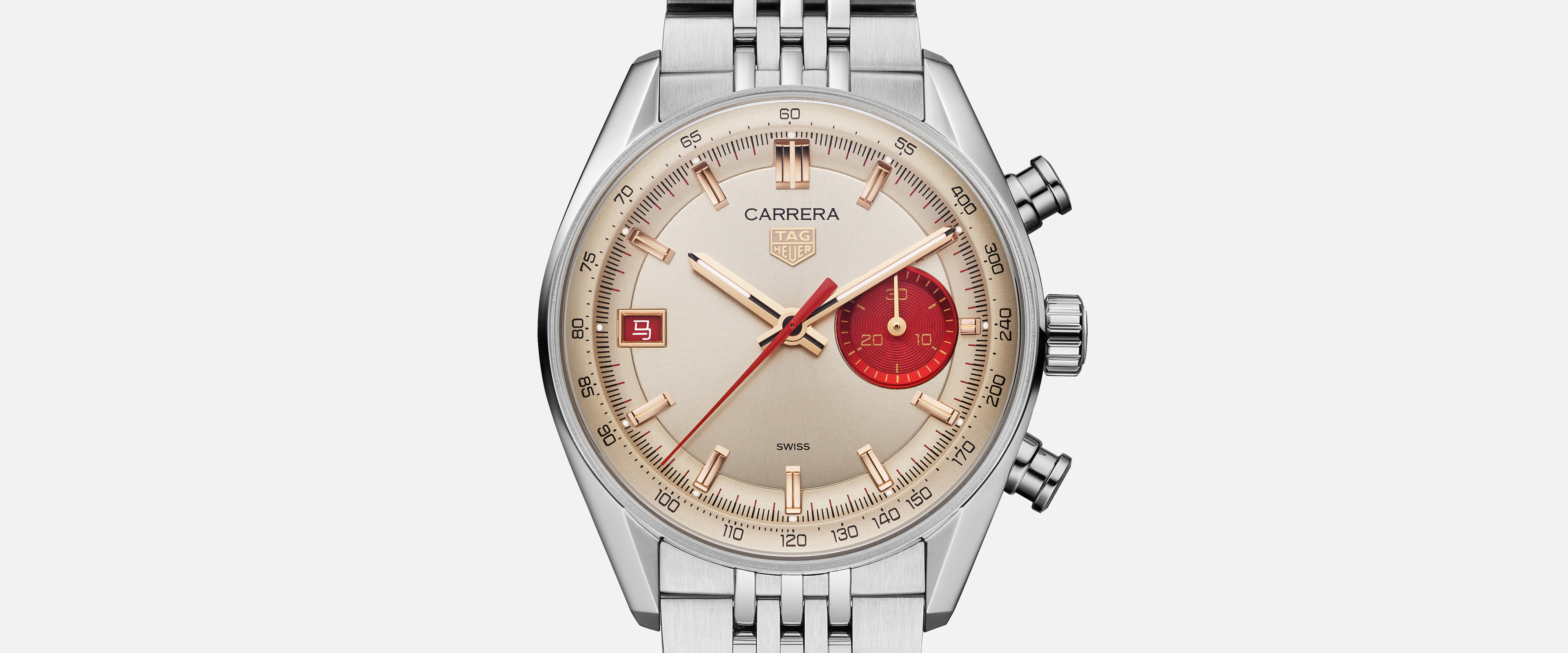 The TAG Heuer Carrera Chronograph Year of the Horse, in a 39mm glassbox case, showcases innovation and elegance. 18K 5N rose gold plated hands and indexes with red accents highlight its bold yet refined design. The exclusive Beads-of-Rice bracelet ensures comfort. The sapphire caseback reveals the Calibre TH20-07 movement with an 80-hour power reserve, symbolizing unrestrained energy and celebrating a racing spirit.