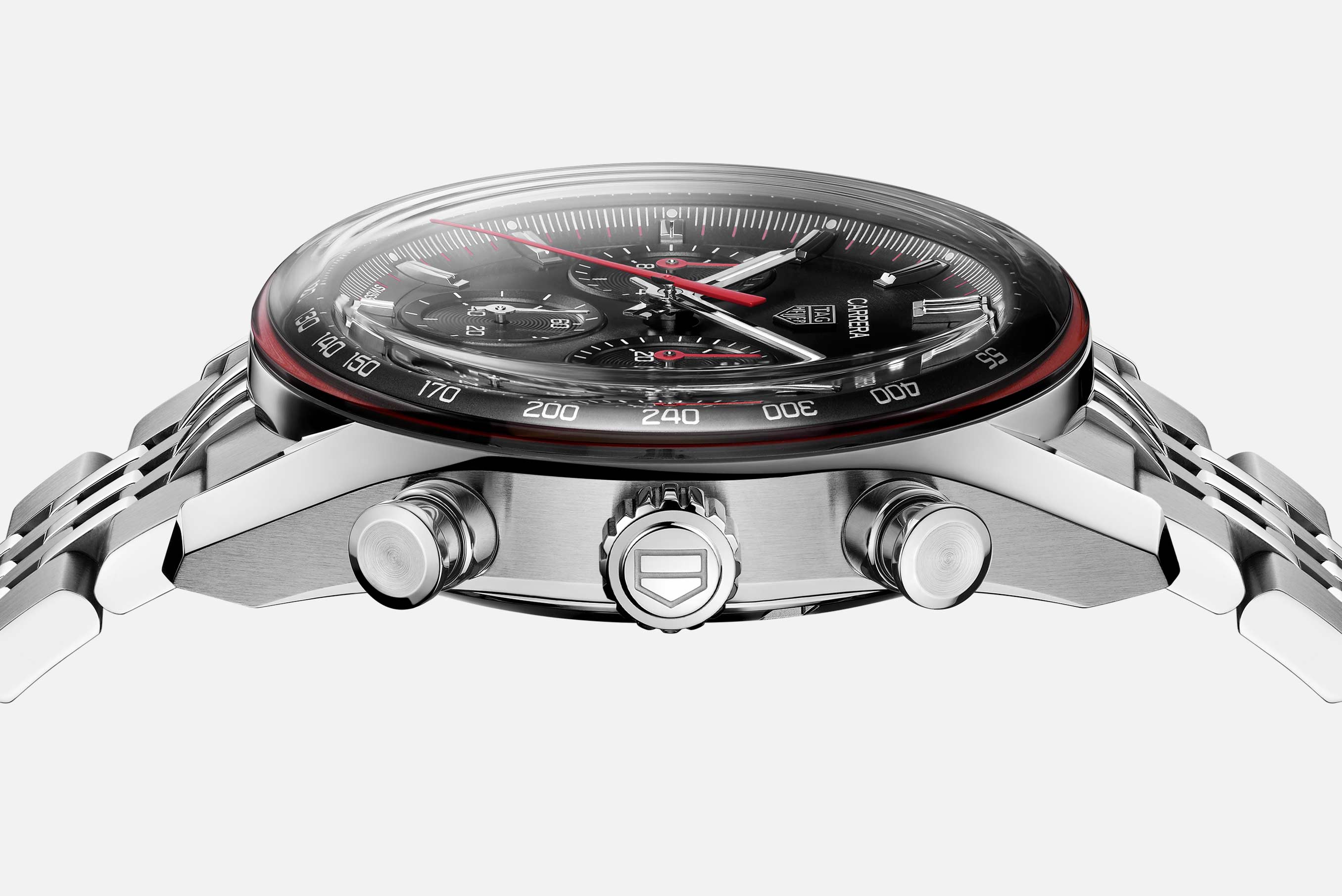 Automatic, 41 mm, Steel CBS2114.BA0053Dynamic and daring, this 41mm TAG Heuer Carrera Chronograph channels the Maison’s racing DNA through a striking black dial with a subtle red outer ring. A bold interpretation of precision and contrast, it brings timeless motorsport heritage into sharp modern focus, driven by the in-house Calibre TH20-01 with 80-hour power reserve.
