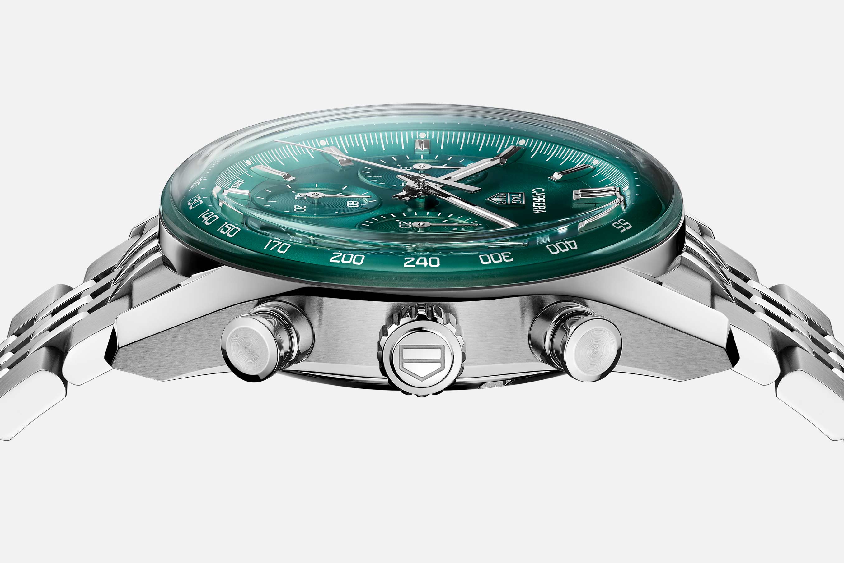 The seven-row steel beads-of-rice bracelet combines flexibility and sophistication. On the rear lug, the engraved Victory Wreath symbolizes success and good fortune, completing this modern expression of TAG Heuer Carrera style and performance.