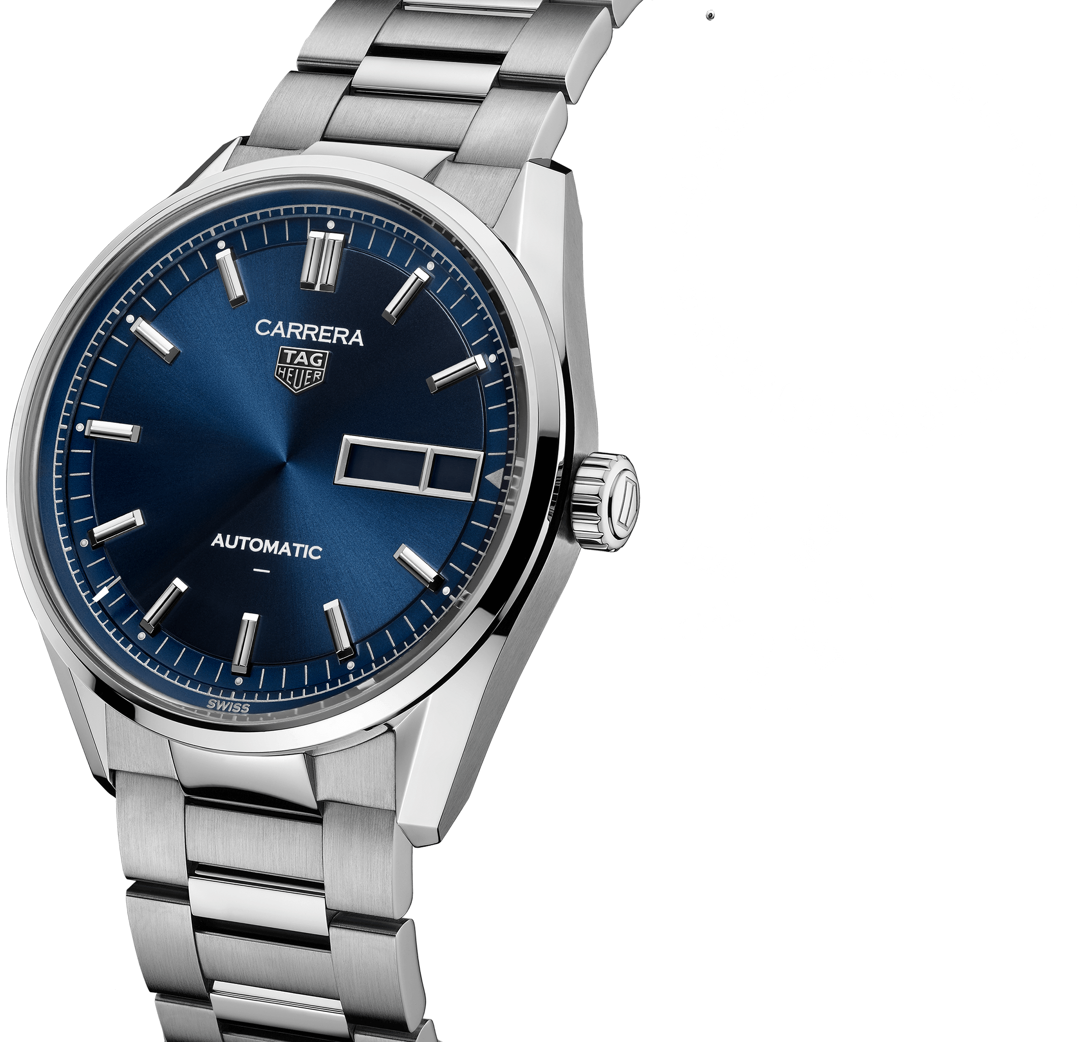 The blue sunray-brushed dial stands out with its vibrant tone, enhanced by rhodium-plated hands and indexes. The slightly curved flange adds a sophisticated touch to the timeless TAG Heuer Carrera design. Engraved on the caseback, the symbolic Victory Wreath honors TAG Heuer’s motorsport legacy, paying tribute to historical victorious racers wearing Carrera timepieces.