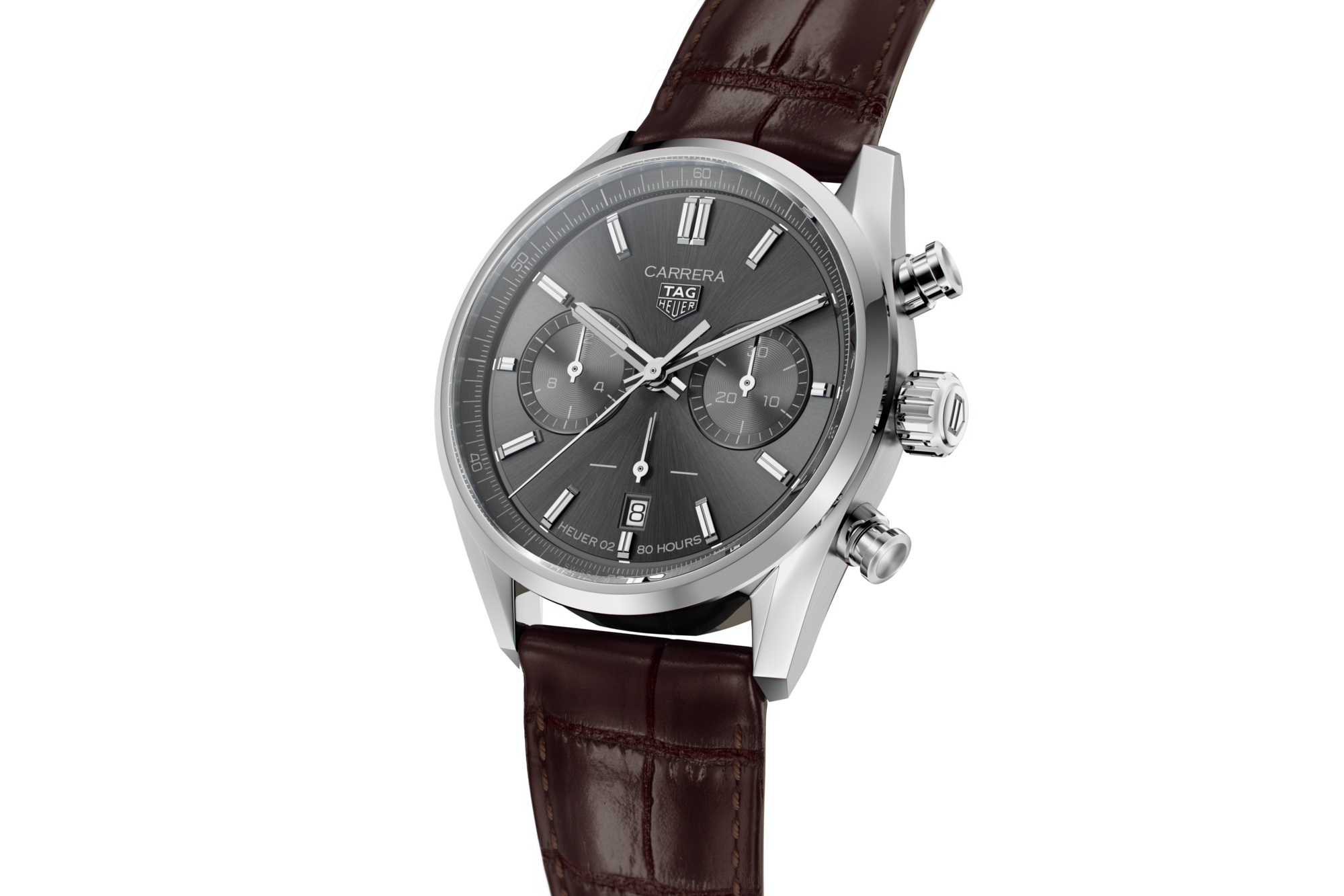 The luxuriant strap in brown alligator is matched with fine-brushed steel. The top-stitched strap is held by TAG Heuer’s steel folding clasp with double safety push-buttons.