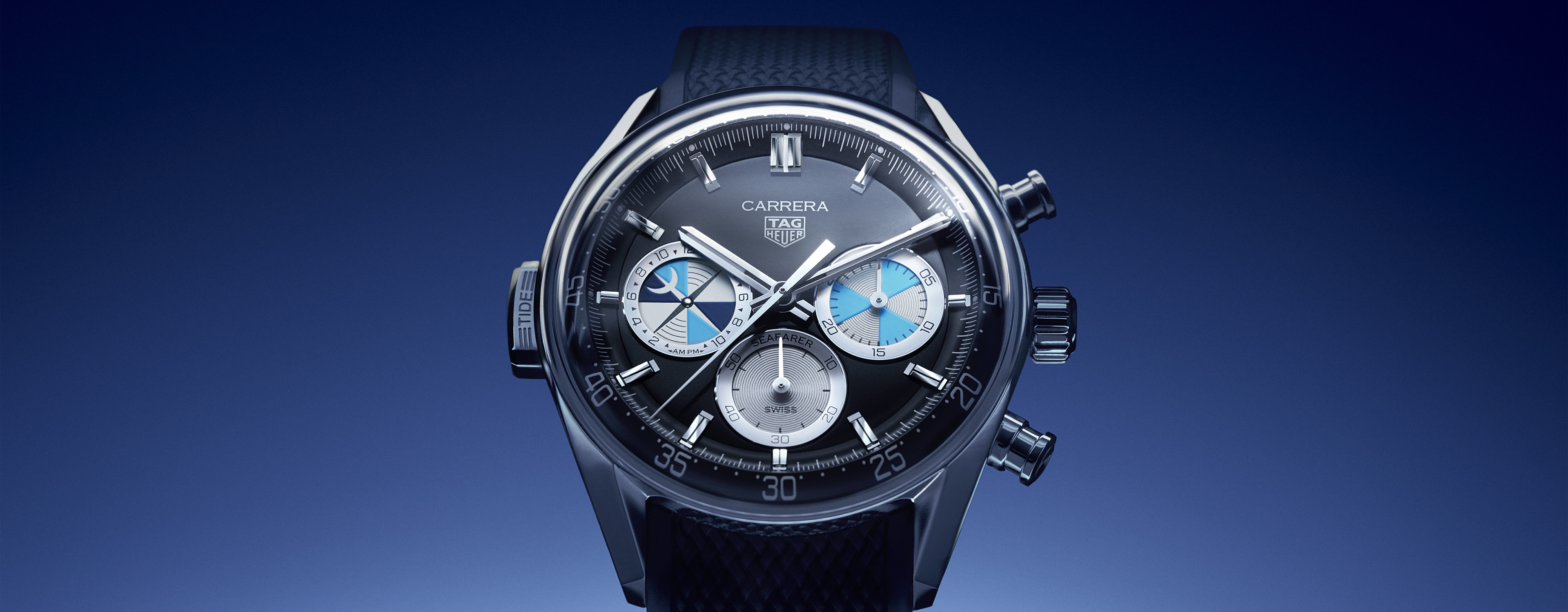 The watch’s black opalin dial is highlighted with contrasting subdials and luminescent markers above the indexes for optimal legibility. The TAG Heuer logo is printed in white and Seafarer writing enriches its classic aesthetic. The dial also features a dedicated contrasting tide indicator counter at 9 o’clock.