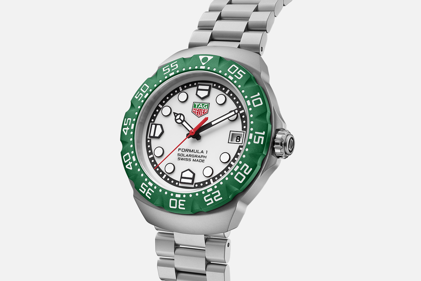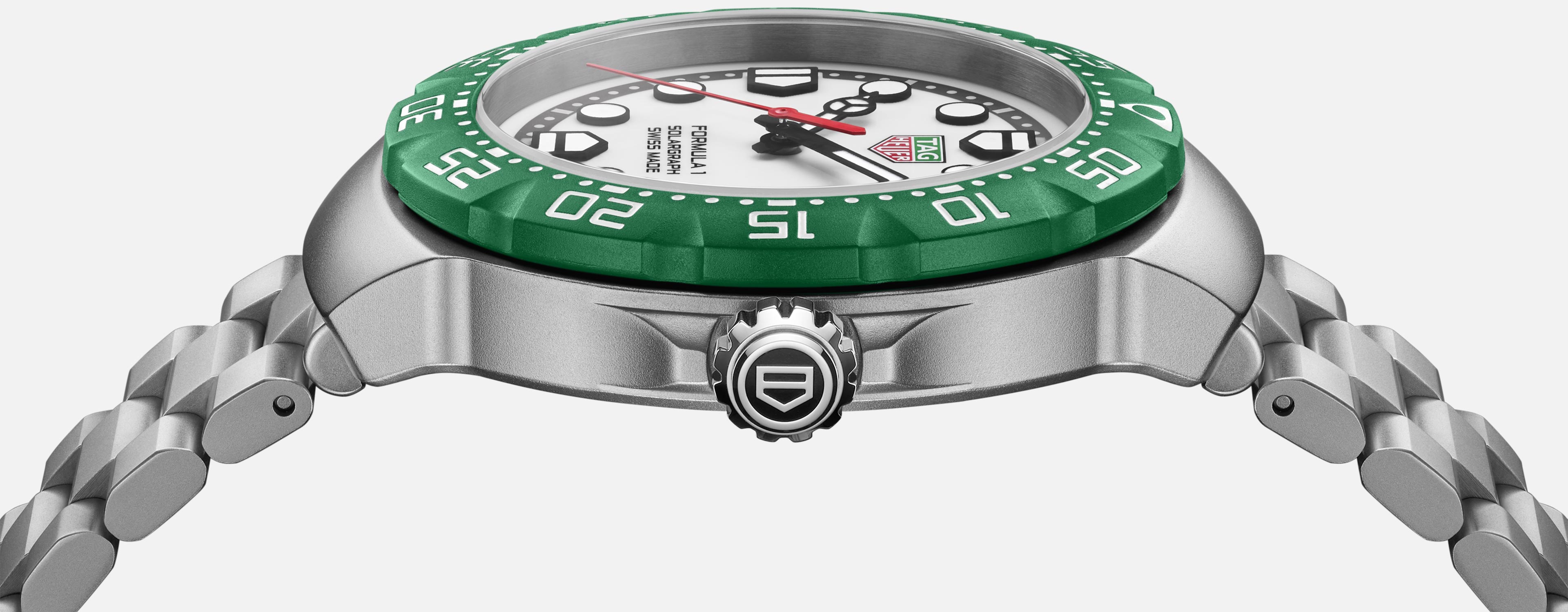 Solar Quartz, 38 mm, Steel WBY111E.BA0042Powered by the in-house Calibre TH50-00, this 38mm TAG Heuer Formula 1 Solargraph channels the brand’s racing heritage into a compact, high-energy design. Inspired by pitlane clocks, the watch’s red, green, and white accents echo the Swiss Maison’s motorsport roots, capturing both color and speed in motion.
