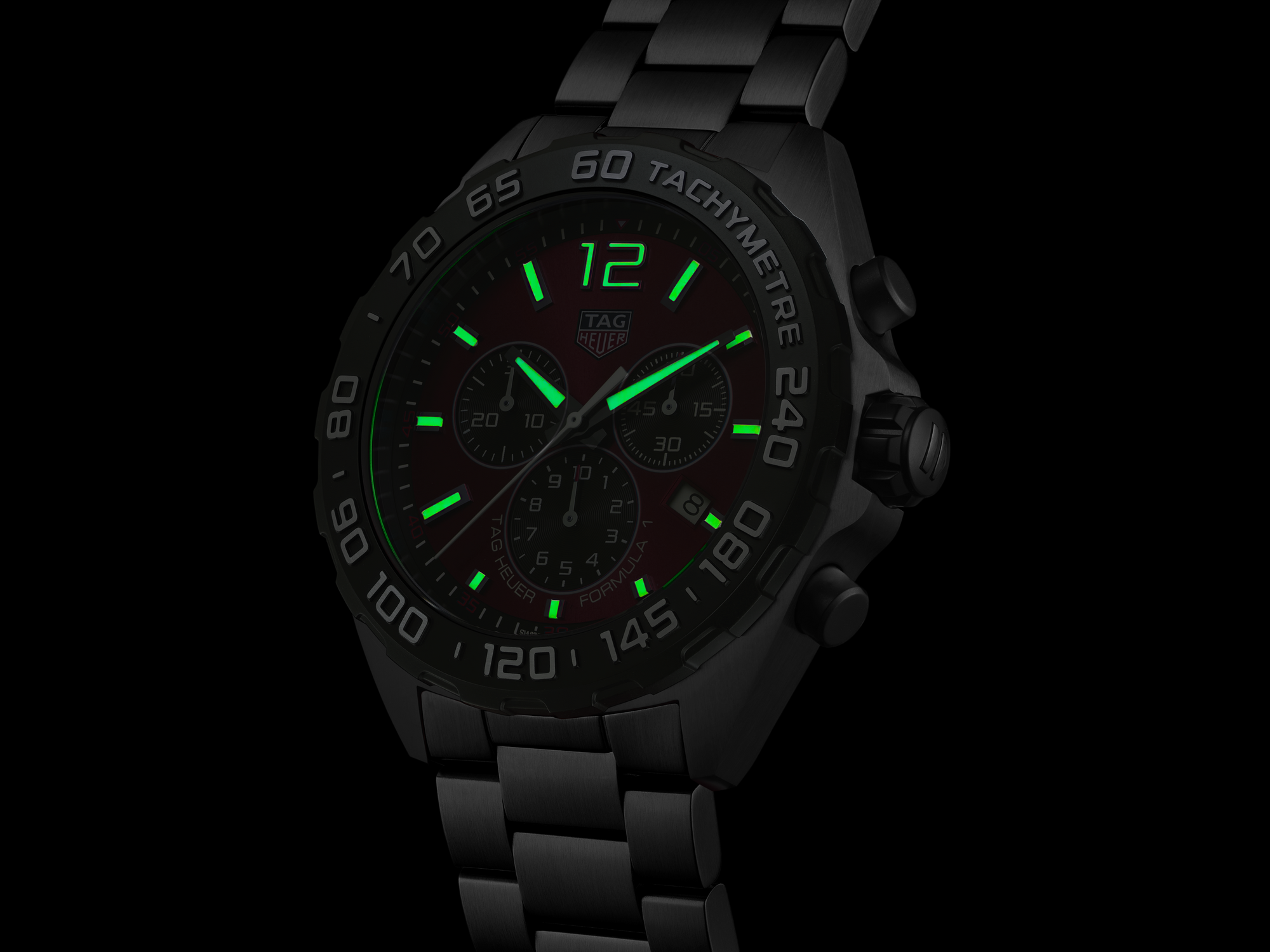 Immerse yourself in the fiery red sunray brushed dial, punctuated by three black azurage finished sub-dials and ultra-legible Super-LumiNova®-applied hands and markers.