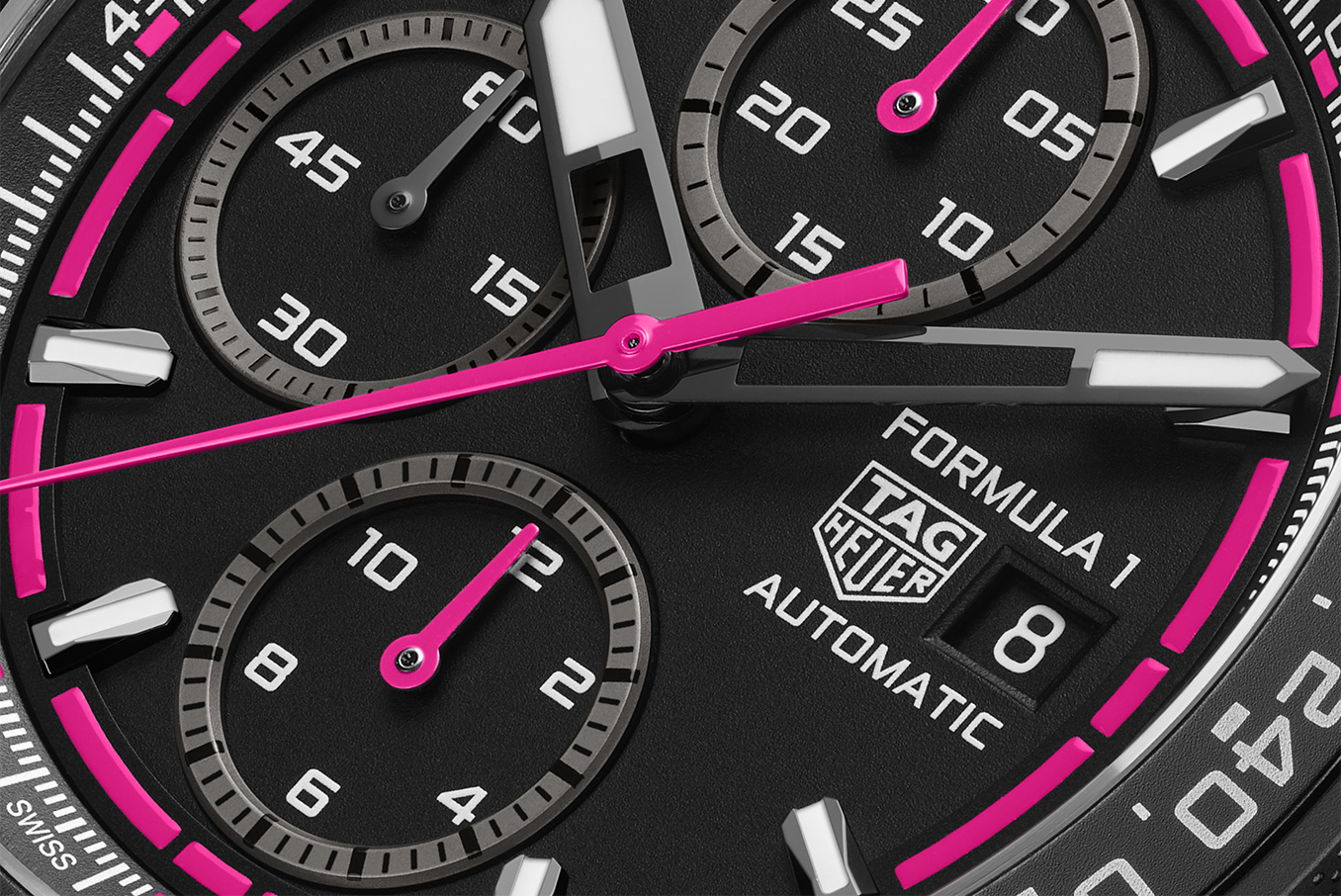 The black opalin dial, accented with a vibrant pink lacquered track, is a testament to motorsport-inspired aesthetics. Subtle details like the Super-LumiNova®-applied hands and a tachymeter bezel bring functionality and visual impact.