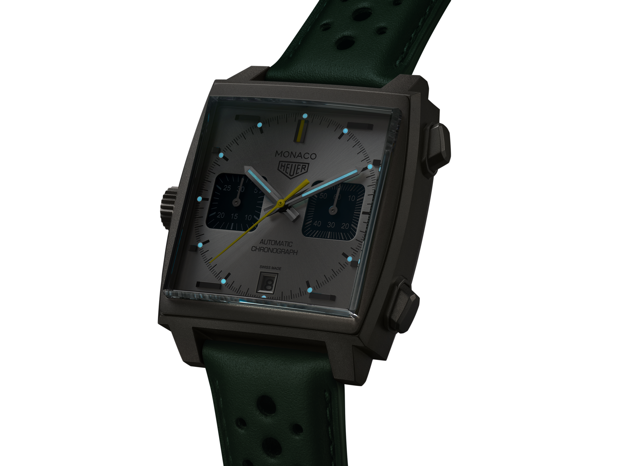 Automatic, 39 mm, Titanium CAW218E.FC6565Experience the essence of racing heritage with the TAG Heuer Monaco Chronograph Racing Green. A bold continuation of the Racing colors saga, this charismatic timepiece embodies the vibrant yet elegant aesthetics of the Monaco's indomitable character, inspired by the iconic Racing Green livery—a nod to the storied past of British racing drivers. This exclusive edition is limited to 1,000 pieces.