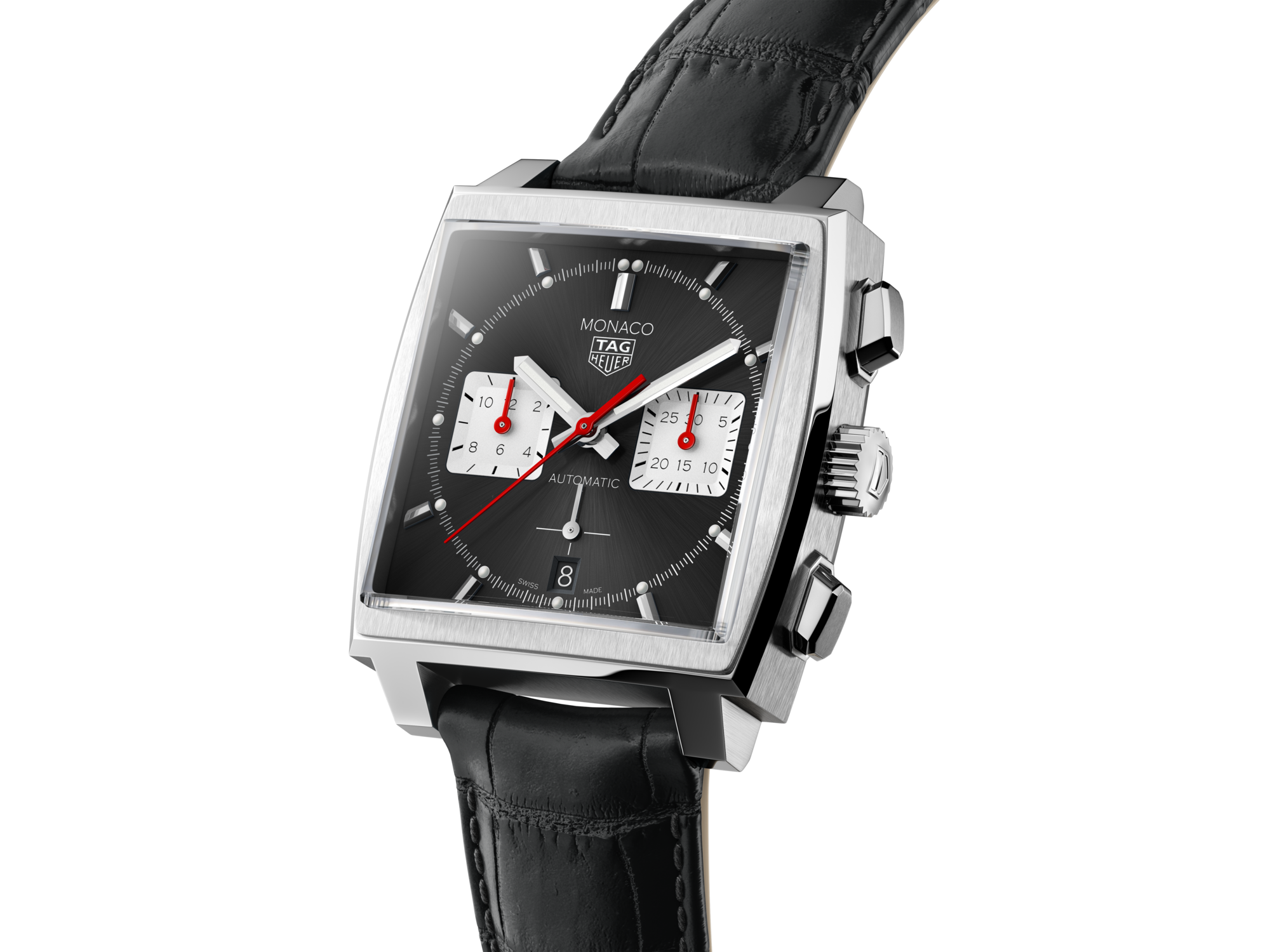 A stunning statement design: this piece takes inspiration from the models of the 1970s. With a bold black dial with a sunray-brushed appearance, the stylistic choices continue to establish the Monaco as much more than a heritage piece.