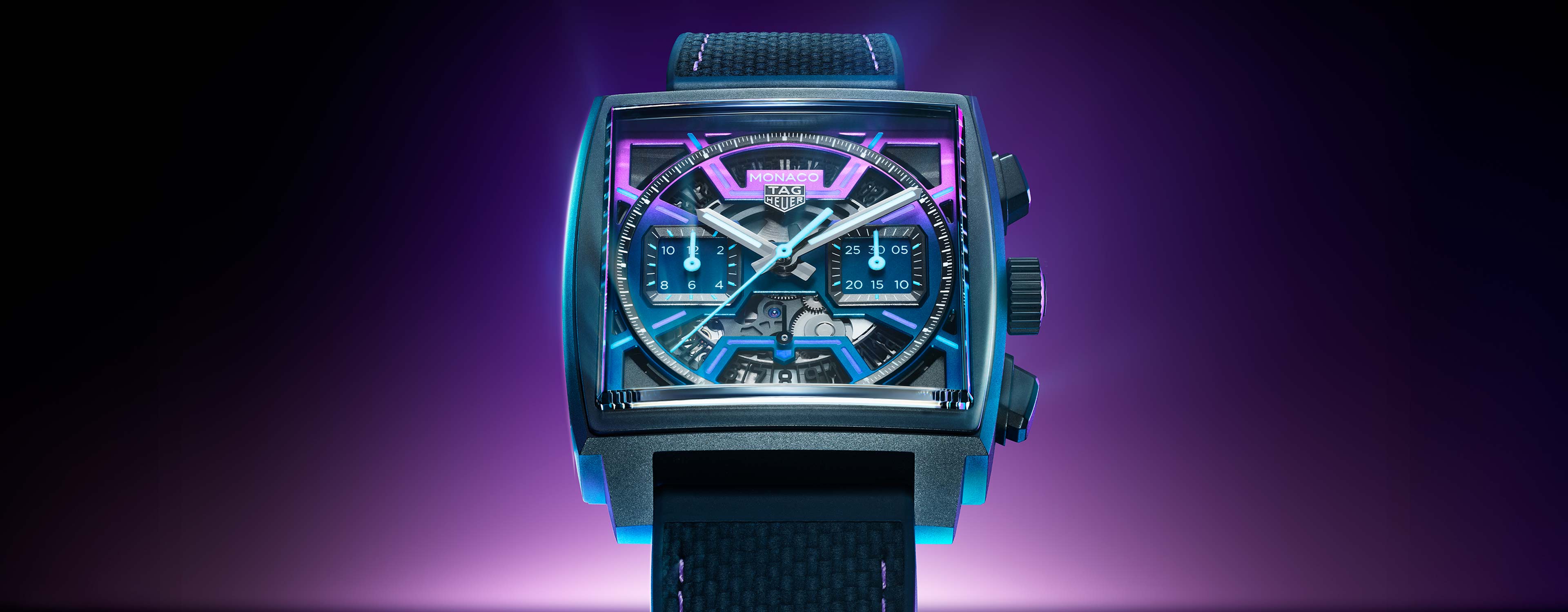 The skeletonized dial boasts a powerful gradient from purple to blue, accompanied by striking luminescent accents that evoke Las Vegas's dazzling nightlife. The bright turquoise chronograph hands further electrify the design while offering perfect legibility.