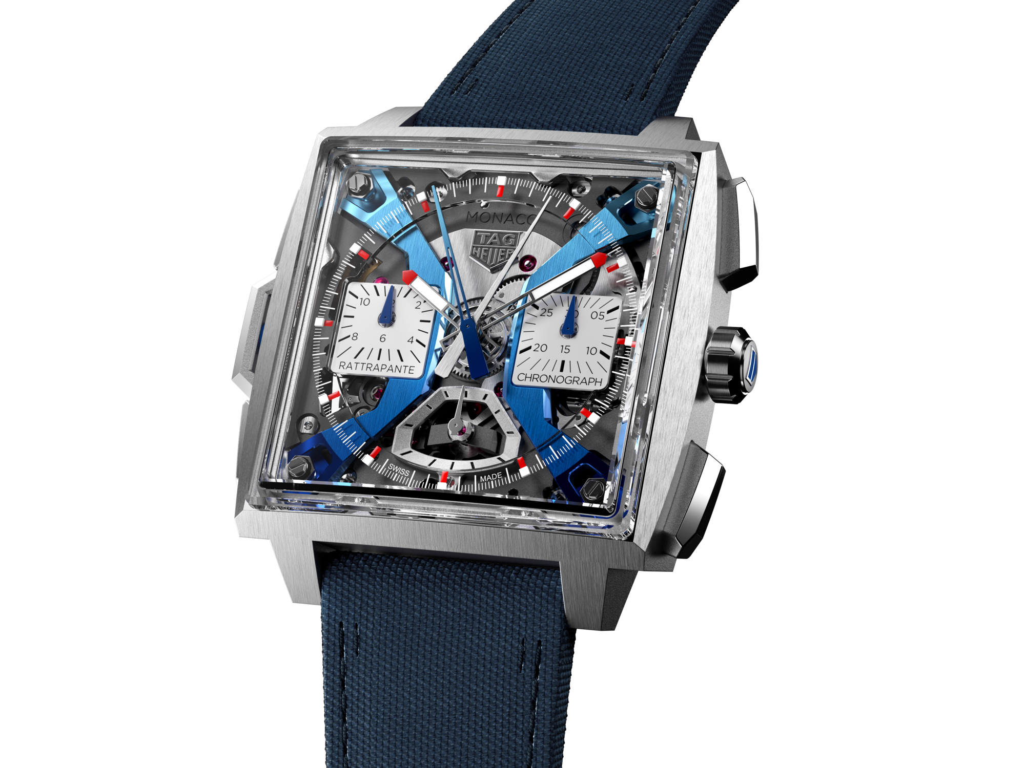 On the split-seconds hand and the titanium dial arches pay a vibrant homage to the original Monaco model from 1969, lending it a modern and dynamic look.