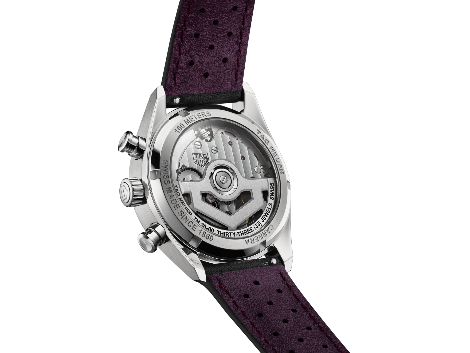 黑色穿孔紫色衬里小牛皮表带与表盘相得益彰。CAPSA可更换系统可贴合于任何手腕,日常佩戴更加舒适。
