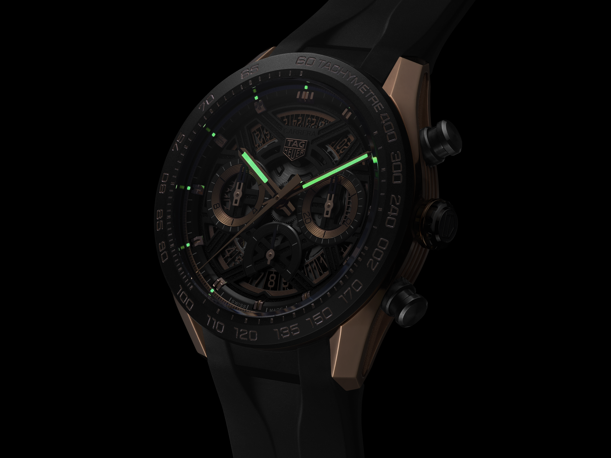 自动机芯, 44 mm, 金和钛金属 CBU2050.FT6273这款独树一帜的泰格豪雅卡莱拉系列计时码表兼具大胆与优雅。令人振奋的计时码表采用镂空设计,点缀玫瑰金装饰细节,彰显赛车运动精神与奢华风范的结合,专为敢于脱颖而出的人士设计。
