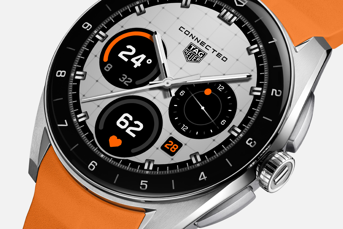 This 40mm connected watch features a finely brushed and polished steel case, a domed sapphire crystal with subtle grey and silver markings, and integrated steel pushers. The sleek design is further enhanced by the vibrant orange rubber strap.
