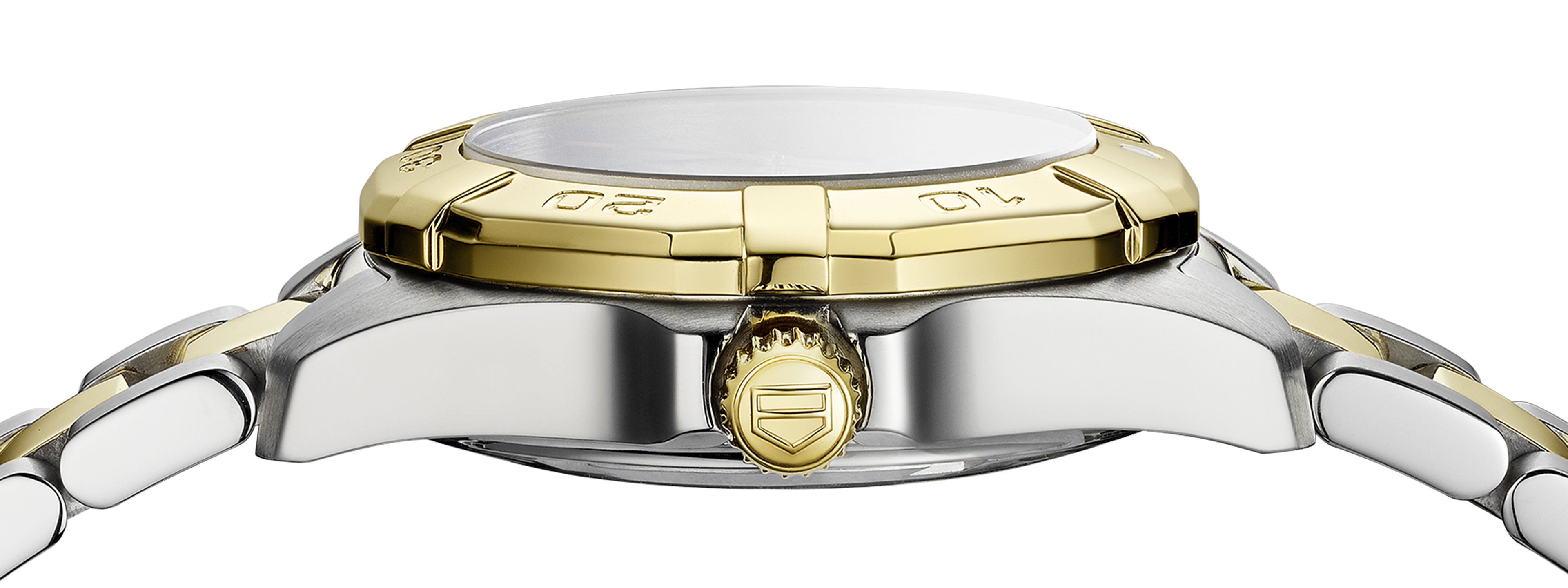 Quartz, 27 mm, Steel WBD1422.BB0321True to the Aquaracer’s iconic design aesthetics, yet stunningly endowed with an 18K 2N gold-plated bezel and diamonds (0.0758 CT). The petite diameter (27mm), gentler case profile and finely worked dial details create superb appeal.
