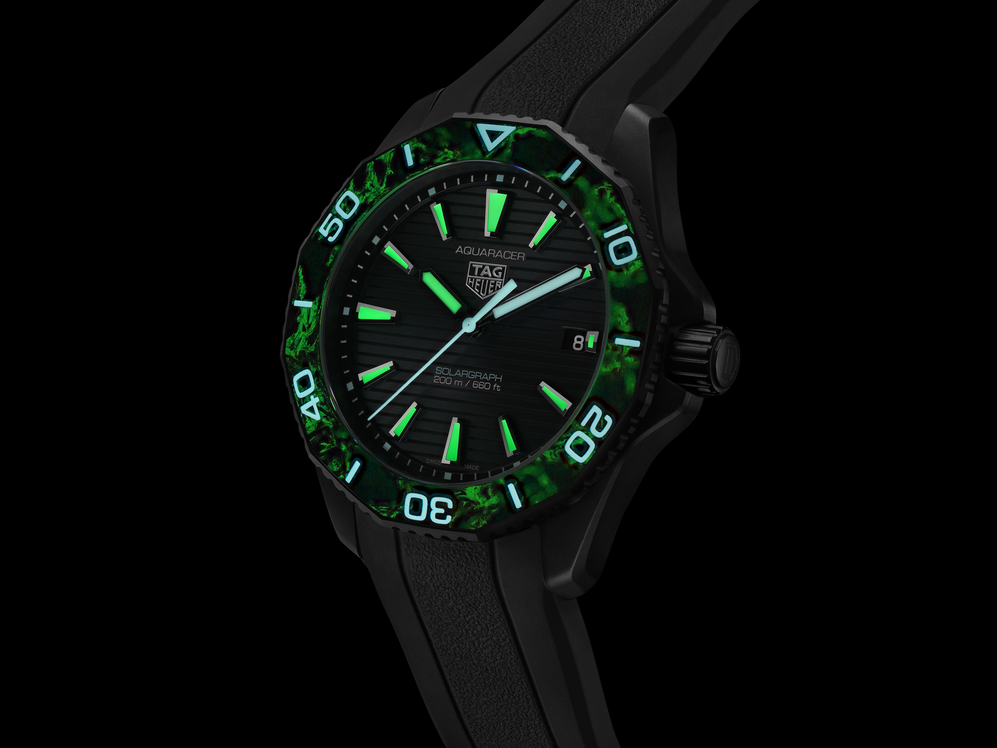 A standout feature of this TAG Heuer Aquaracer is its bezel inserts, made from carbon fused with luminous material for maximal legibility, day and night.