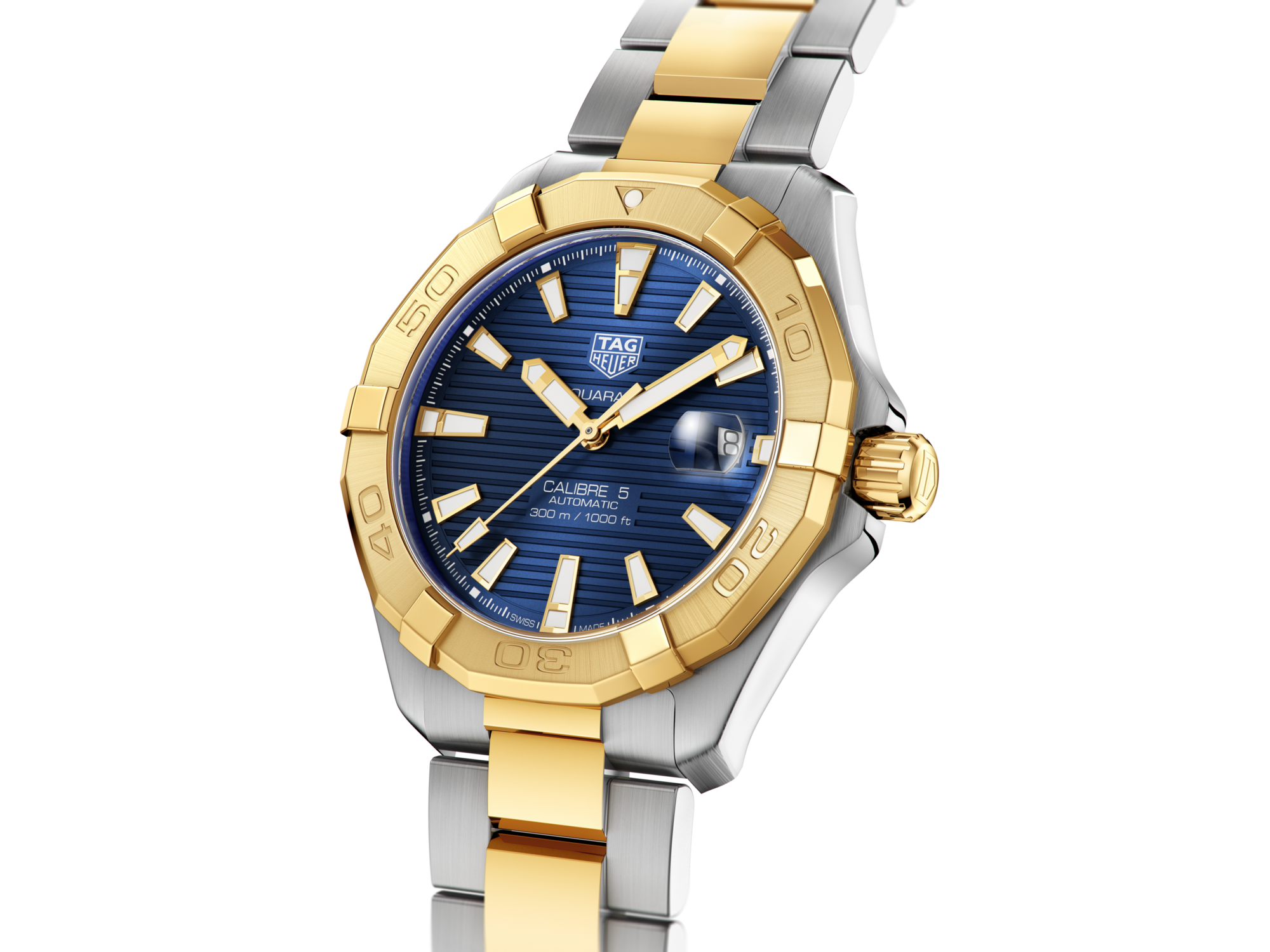 Automatic, 41 mm, Steel WBD2120.BB0930A 41mm steel case polished and fine-brushed, matched with a lustrous blue sunray brushed dial and precious 18K yellow gold-plated 60-minute scale unidirectional turning bezel, hands and applied indexes. Timeless elegance, instantly recognizable.