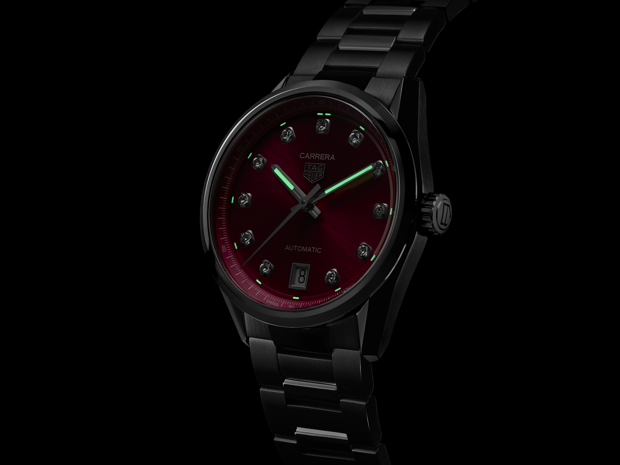 Automatic, 36 mm, Steel WBN2318.BA0001Experience timeless elegance with the TAG Heuer Carrera Date, featuring a captivating 36mm steel case and a vibrant pink snail-brushed dial that radiates feminine charm. This bold timepiece is adorned with 11 VS diamonds totaling 0.22 ct set as hour markers, enhancing its luxurious appeal.