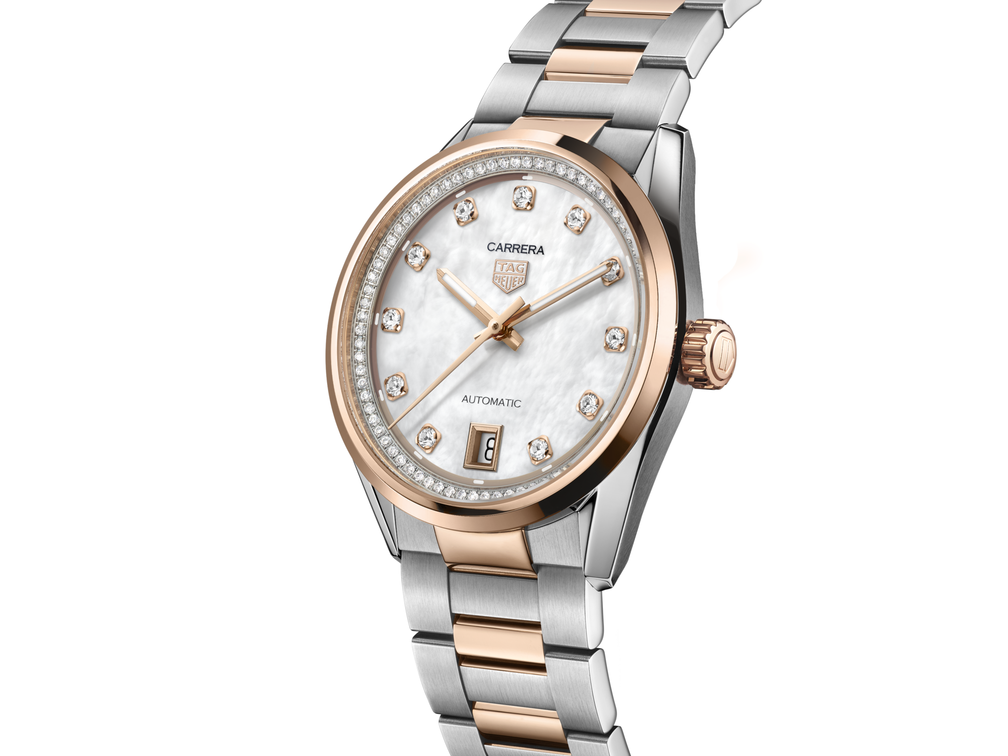 Automatic, 36 mm, Steel WBN2351.BD0000Delve into refined elegance with this 36mm TAG Heuer Carrera Date, where the iridescence of mother-of-pearl echoes the timeless luxury of 18K 5N solid rose gold—a tribute to the original Carrera's legacy, reimagined with classic sophistication.