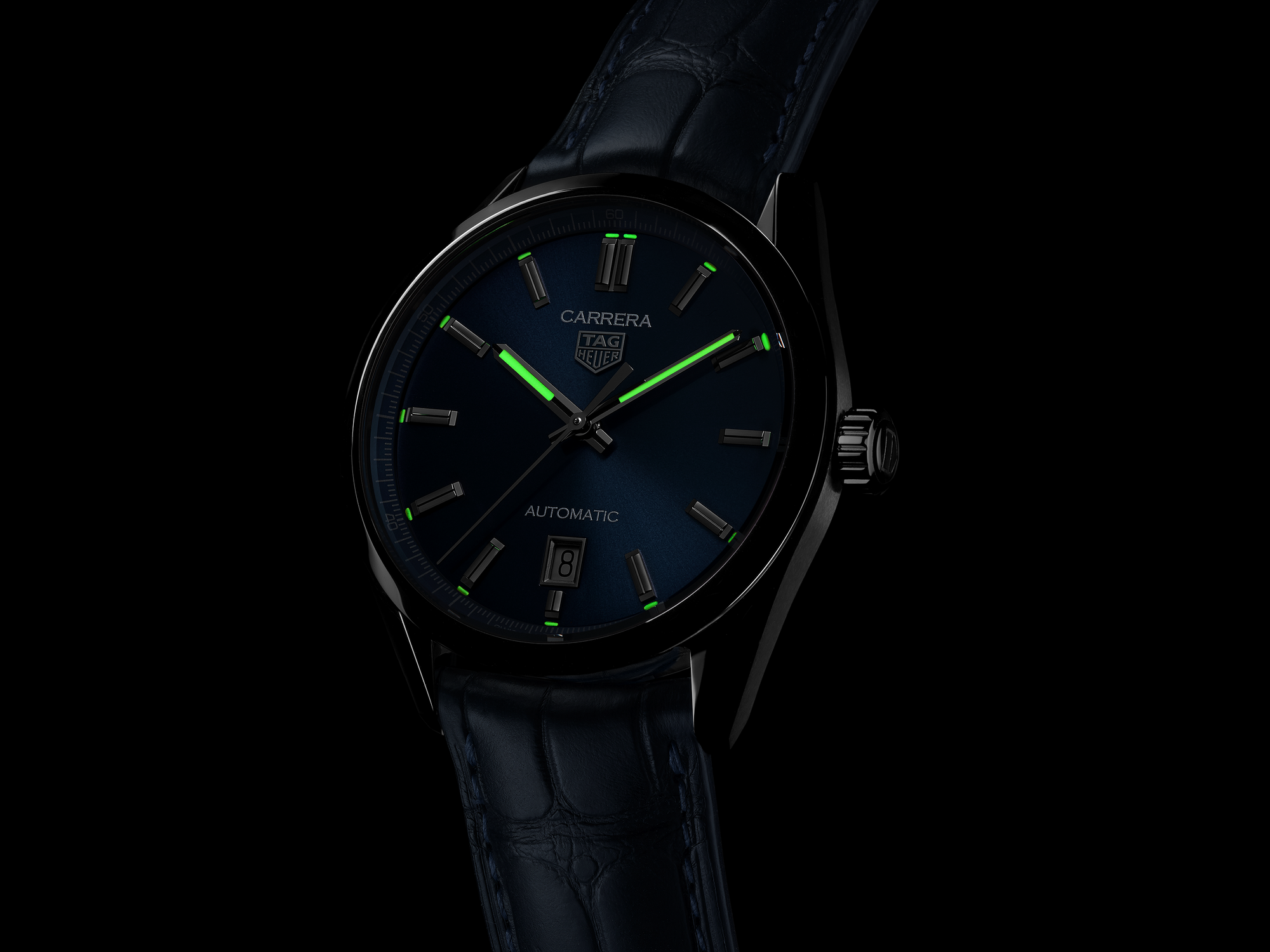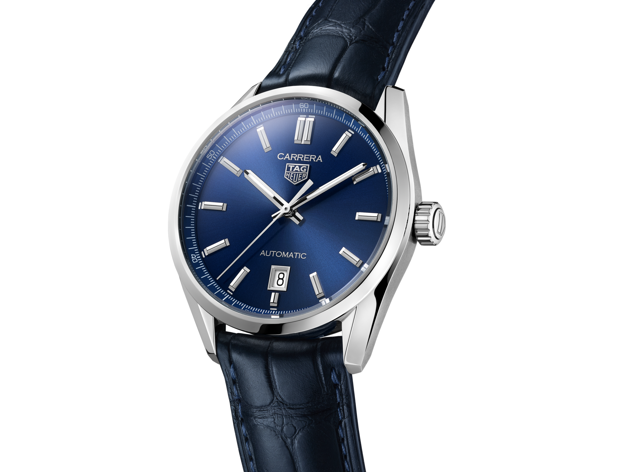Offering urban looks and precise timekeeping, the TAG Heuer Carrera is powered by the manufacture Calibre 5 automatic movement, and features a date display at 6 o’clock.