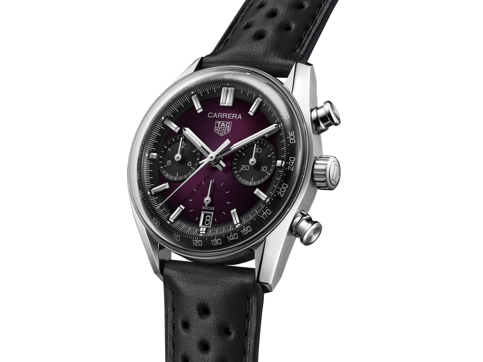 Automatic, 39 mm, Steel CBS2219.FC6607Elevate your style with the TAG Heuer Carrera Chronograph, where cutting-edge design meets vibrant color. Featuring a striking smokey purple sunray brushed dial, this watch blends precision with elegance, creating a bold, unisex timepiece ready for any occasion.