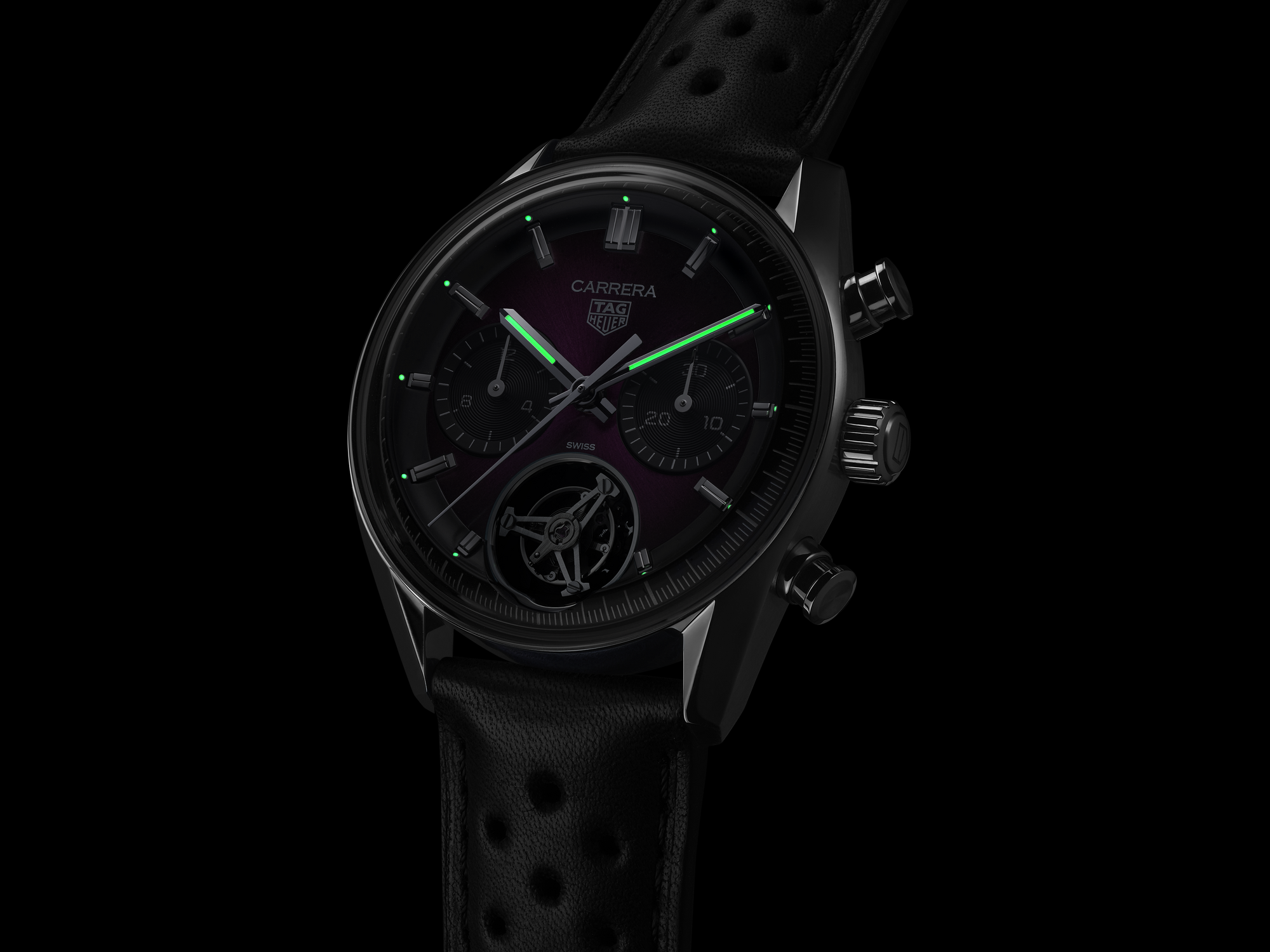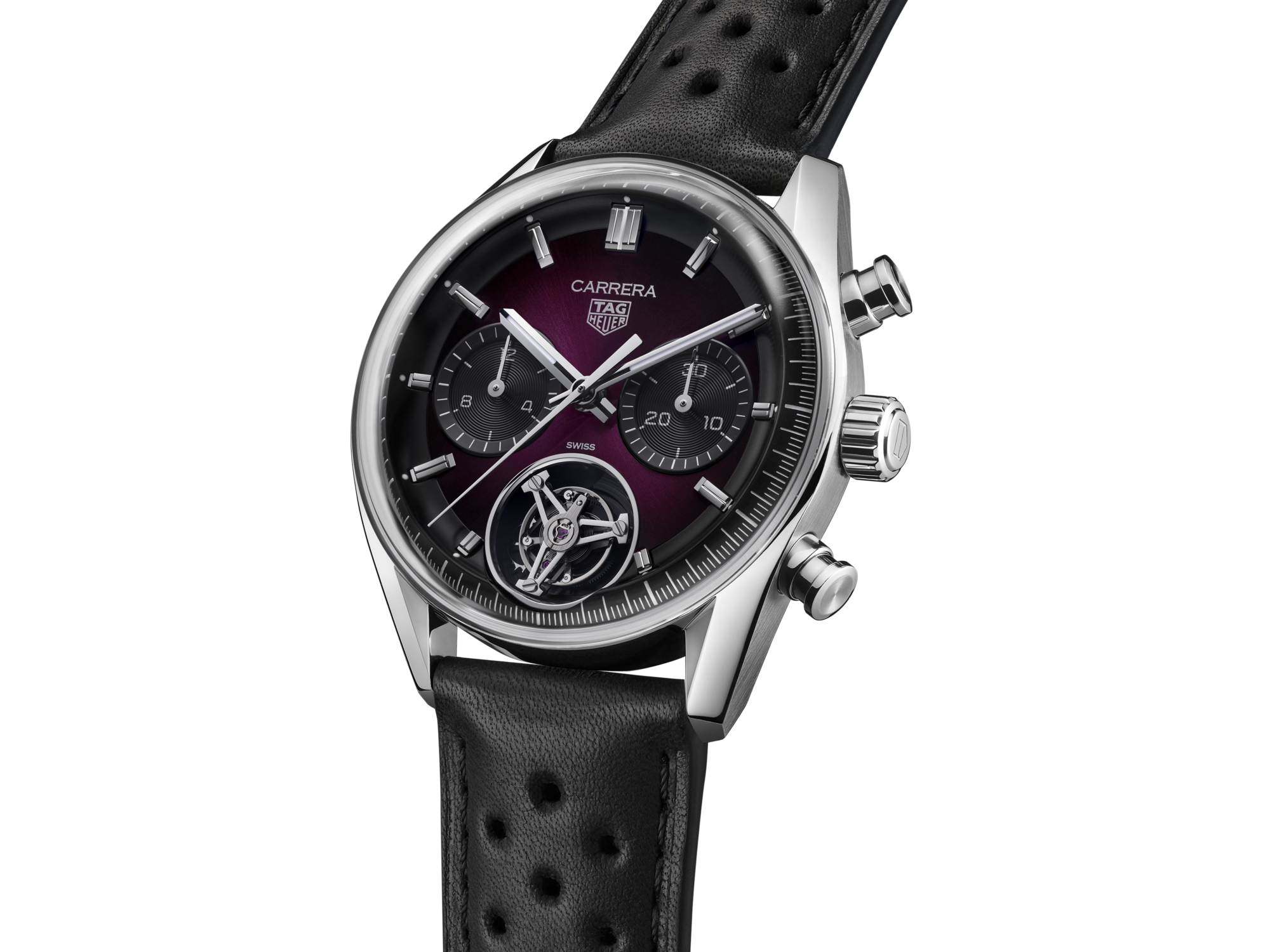 Automatic, 42 mm, Steel CBS5017.FC6605The TAG Heuer Carrera Chronograph Tourbillon combines precision and elegance with a bold new color. Featuring a smokey purple sunray brushed dial and our in-house Heuer 02 (TH20-09) tourbillon movement, this strictly limited edition of only 200 pieces offers unrivaled sophistication for the modern watch connoisseur.