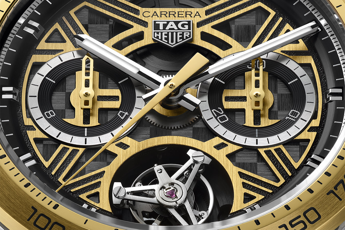 The openworked dial, built around the TAG Heuer shield, exudes the energy of the racetrack. Accents in 18K 3N yellow gold plating illuminate the chronograph counters and central hand, while on the bezel, the silver "F1" logo and “75” tachymeter marking highlight the anniversary. The tourbillon at 6 o'clock is the undeniable centerpiece, showcasing the watch's beating heart.