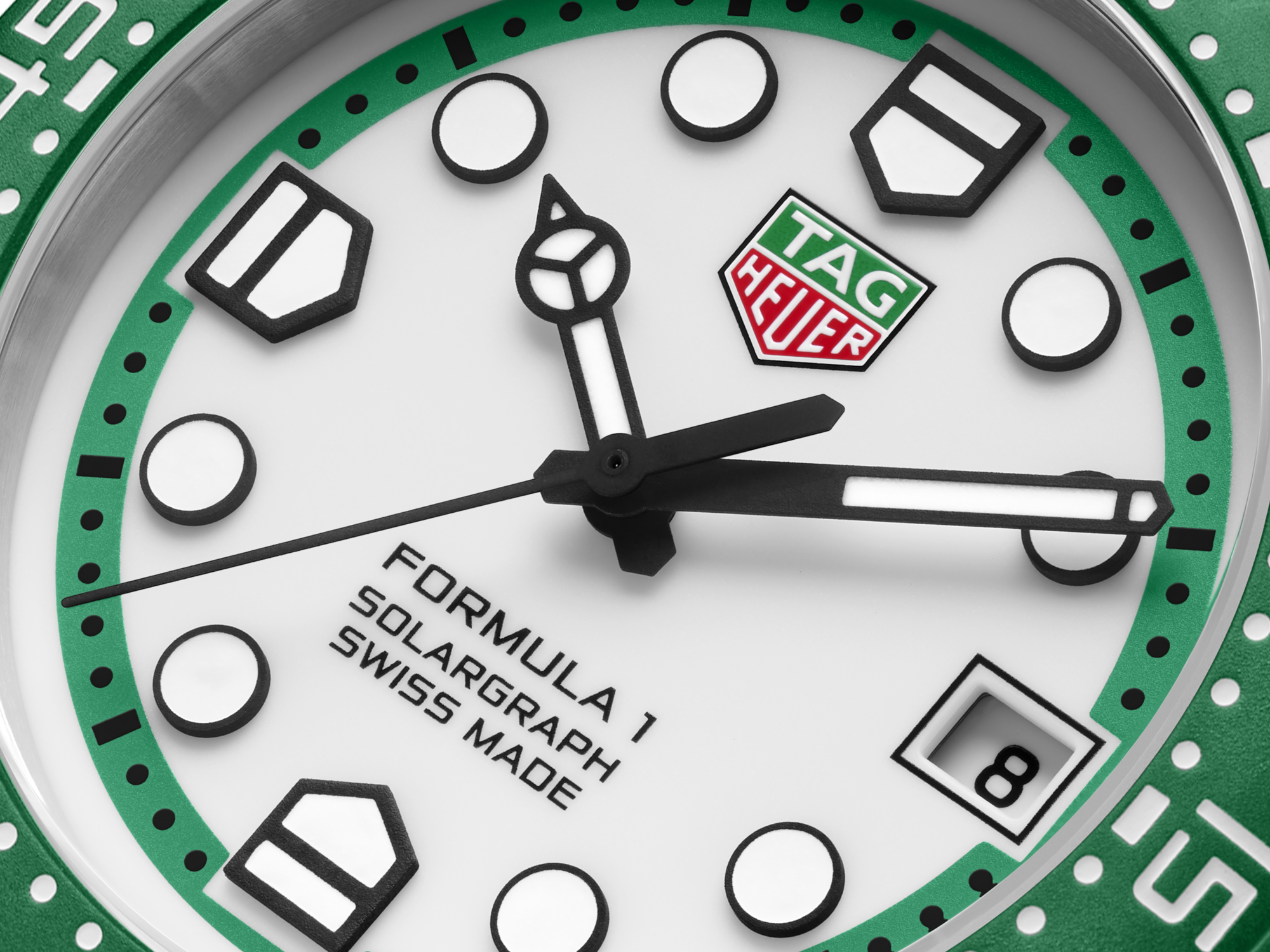 Solar Quartz, 38 mm, Steel WBY1113.BA0042With its bold green accents and advanced Solargraph technology, the TAG Heuer Formula 1 Solargraph (38mm) injects fresh energy into the collection. Showcasing a contemporary design, this exclusive timepiece combines innovation with modern-day versatility.