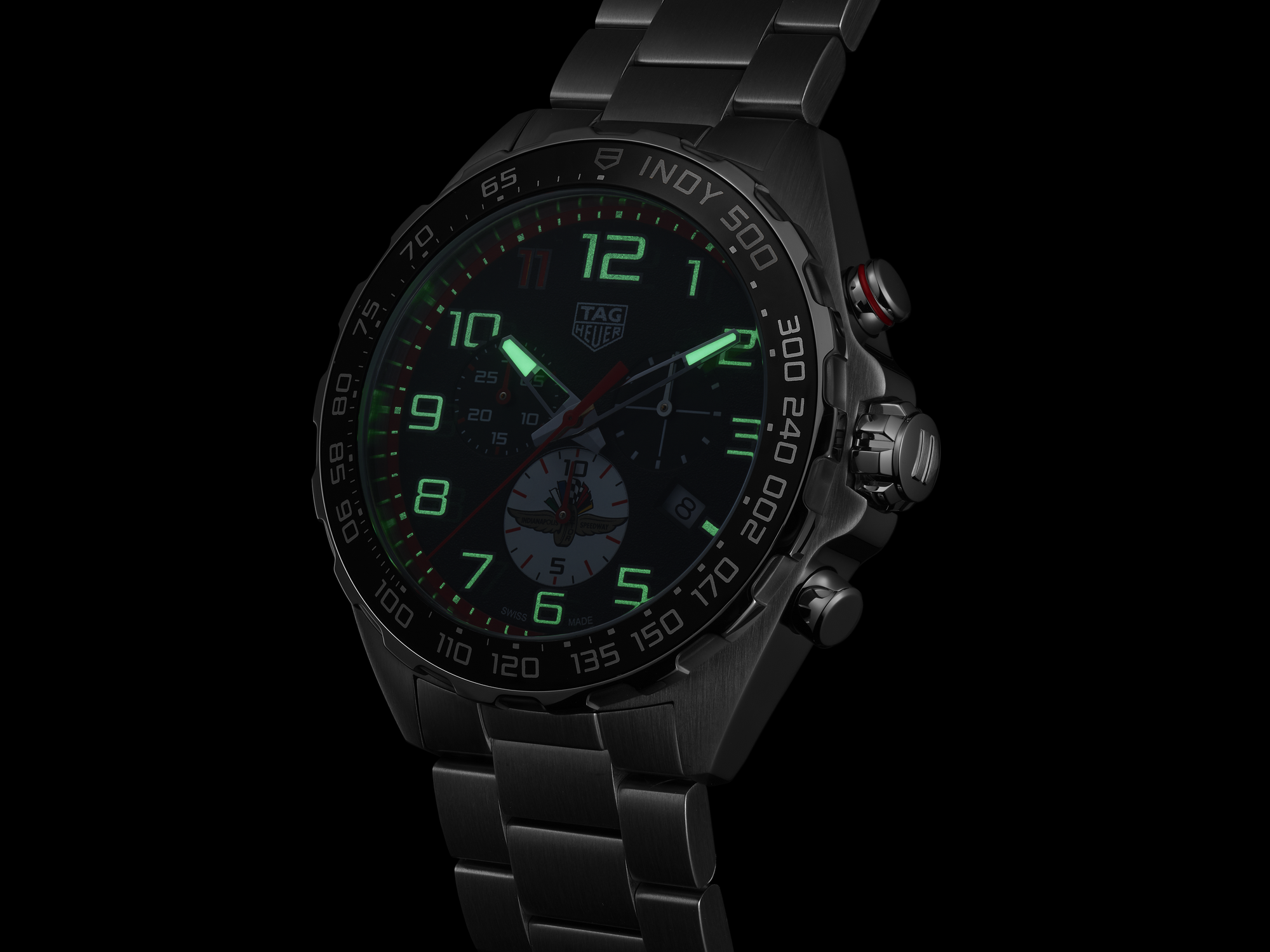 The black-grained dial stands out with its distinctive printed Arabic indexes, its bold red highlights, and the iconic Indy 500 logo featured on the 6 o’clock chronograph subdial.