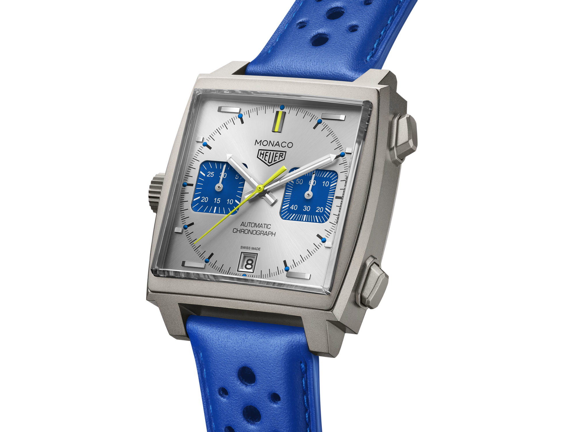 On the silver sunray brushed dial with twin blue counters, the lime-yellow hands and indexes give the dial a fresh look.