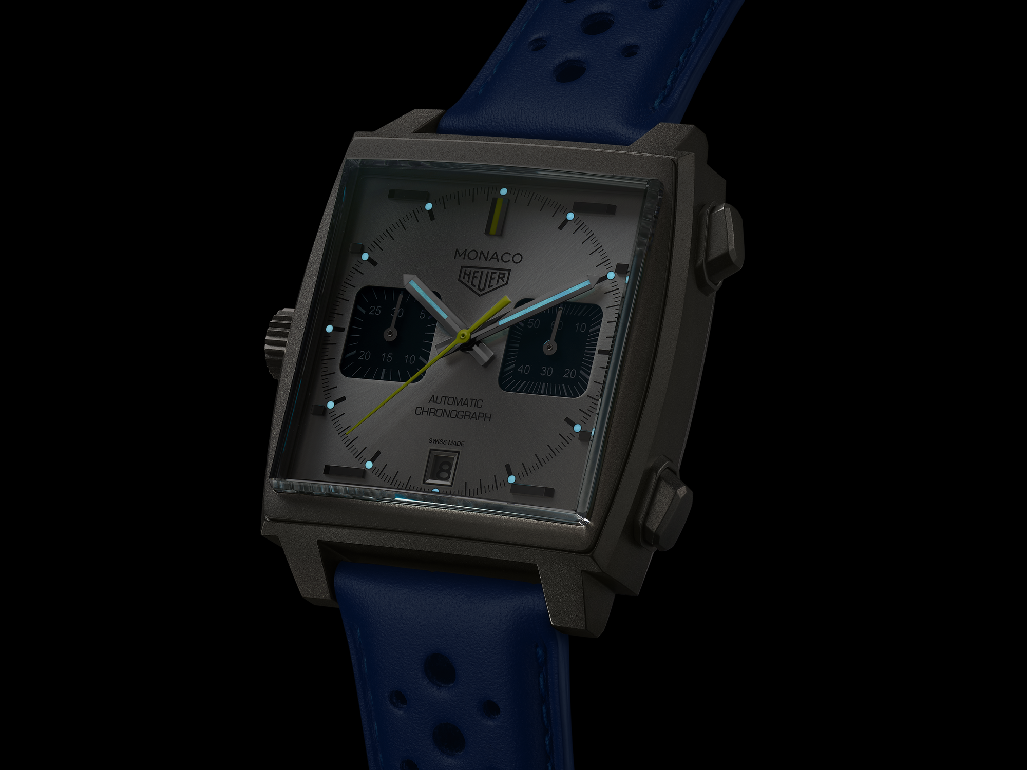Intensely blue like the calfskin leather strap and subdials, the dedicated packaging of this TAG Heuer Monaco shows contrasting lime yellow linings.
