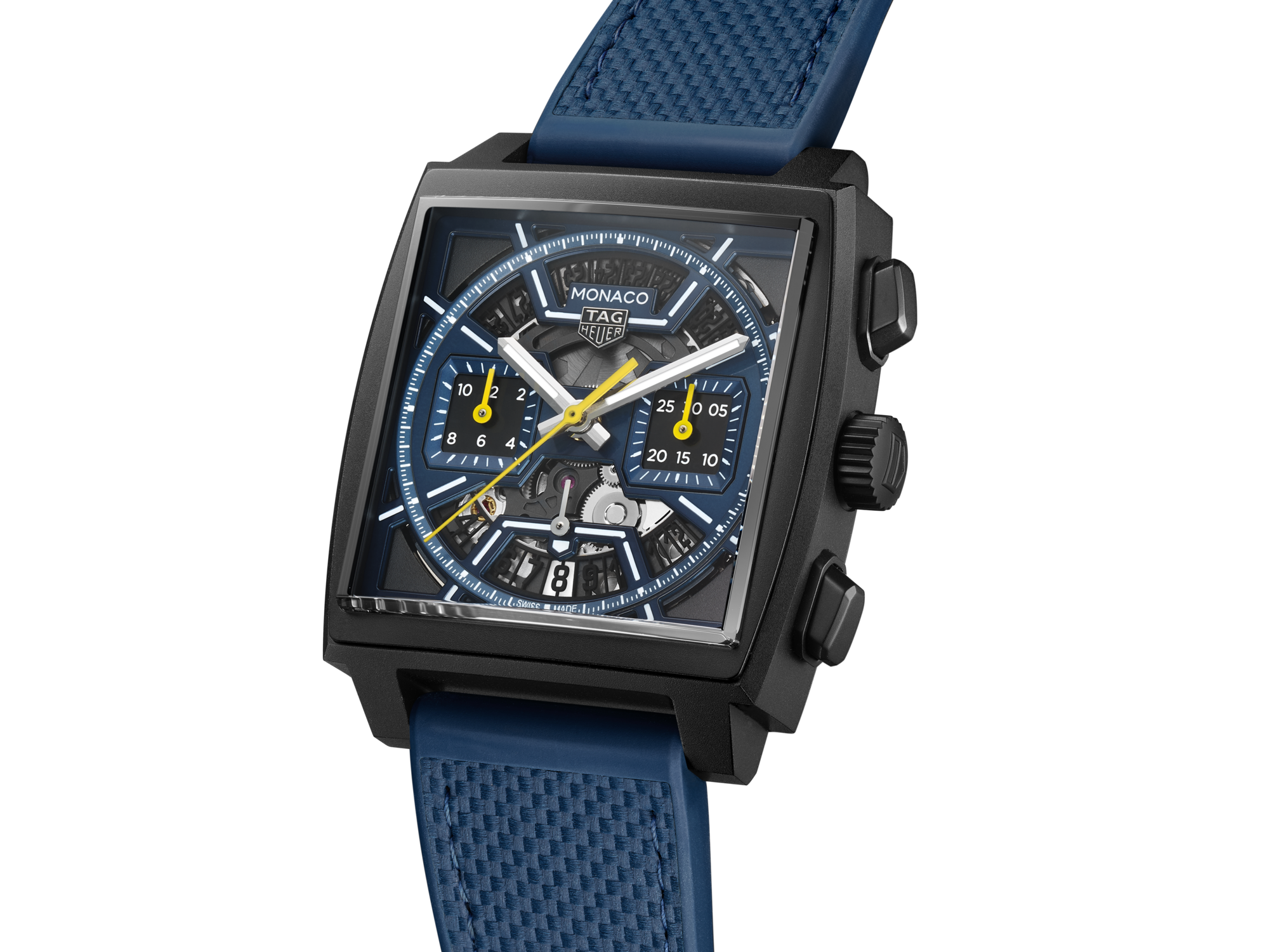 Automatic, 39 mm, Titanium coated with DLC CBL2188.FT6261Embrace the thrill of the race with this dark blue TAG Heuer Monaco. A modern reinterpretation of an iconic design, this timepiece combines a bold blue and yellow palette with a contemporary skeleton dial—A fiercely charismatic icon.